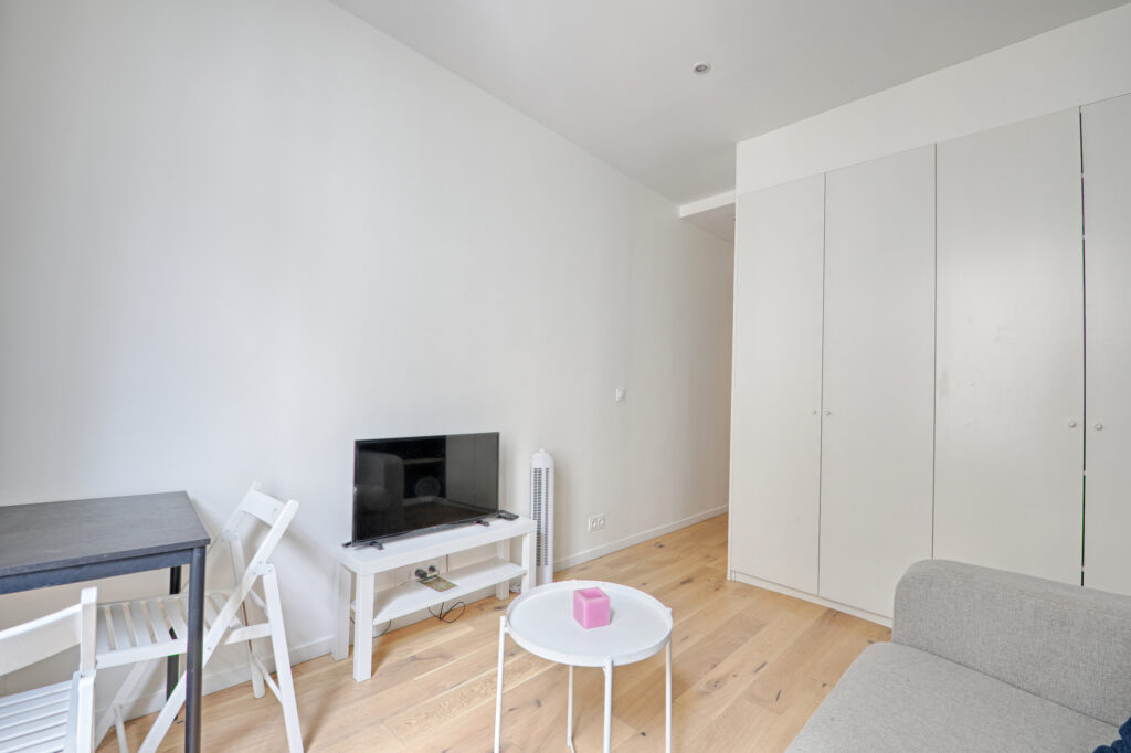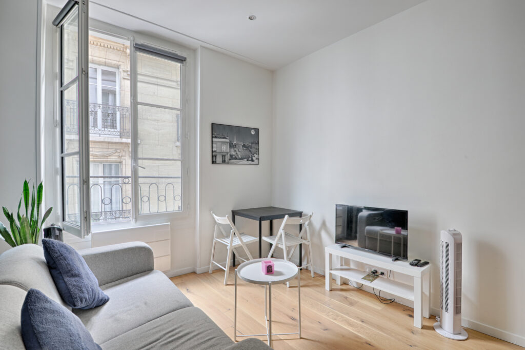 2 pièces meublé, traversant, donnant sur rue calme et sur cour, situé au 3ème étage. Une chambre est séparée sur cour et est équipée d’un lit pour 2 personnes. Le salon donne sur rue et est équipé d’un canapé convertible 2 places. Cet appartement est doté de nombreux rangements. Prestations de qualité, cuisine équipée, lave-linge , salle de douche, WC.