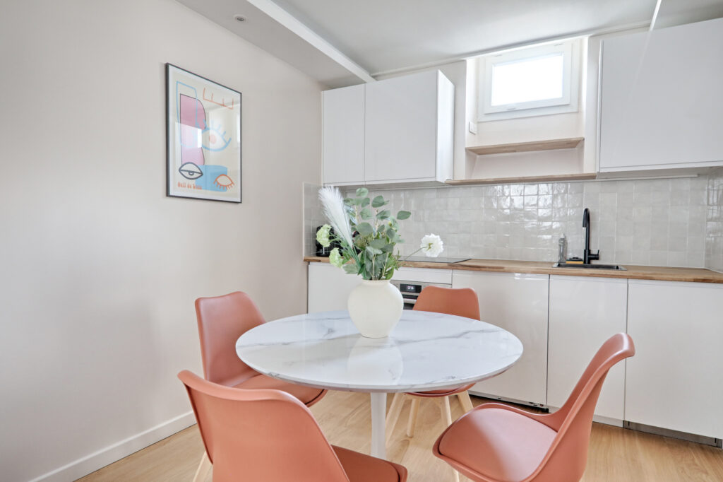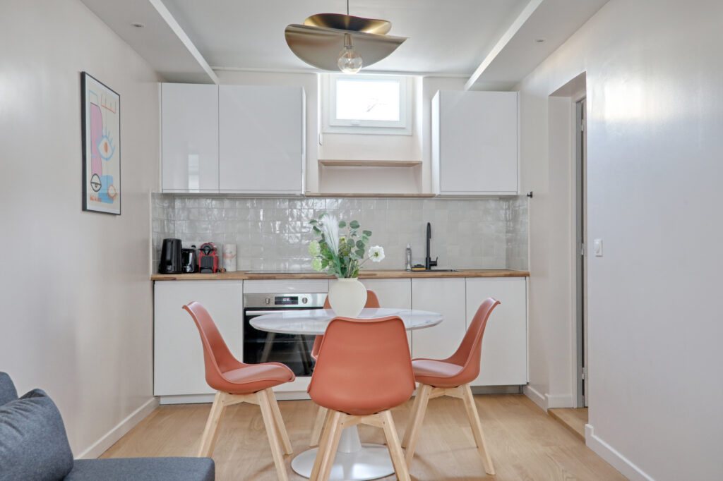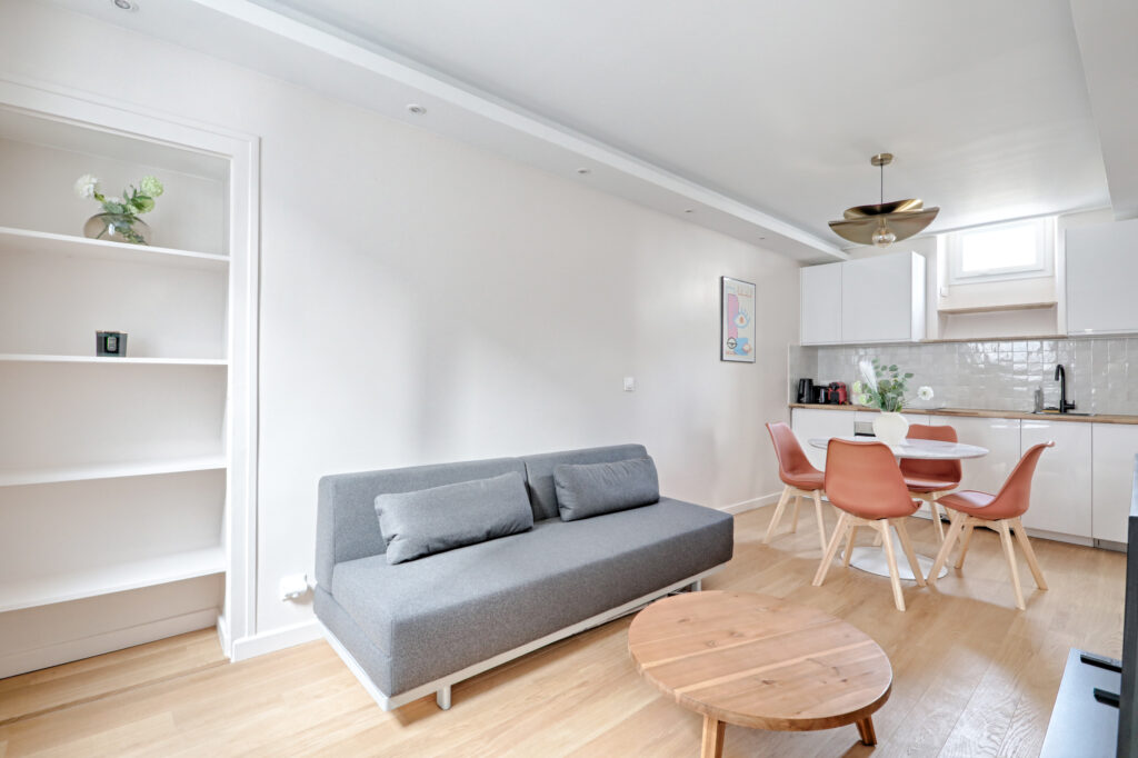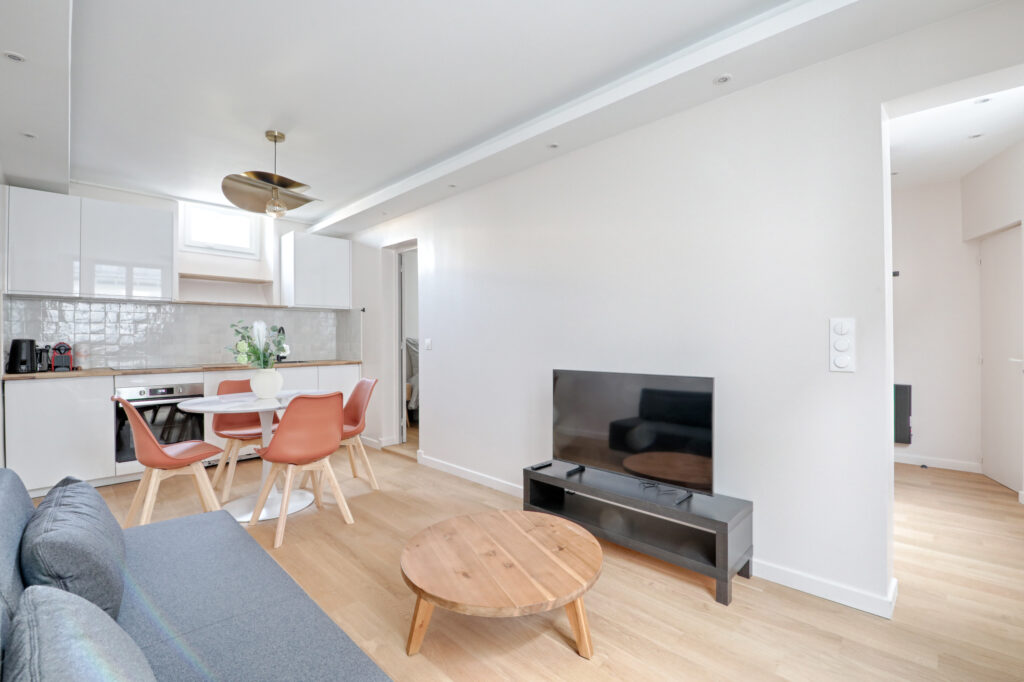 2 pièces de 32m2, donnant sur cour calme, situé au 5ème étage sans ascenseur. Une chambre est séparée et est équipée d’un lit pour 2 personnes. Dans le salon se trouve un canapé convertible. Cet appartement est doté de nombreux rangements.