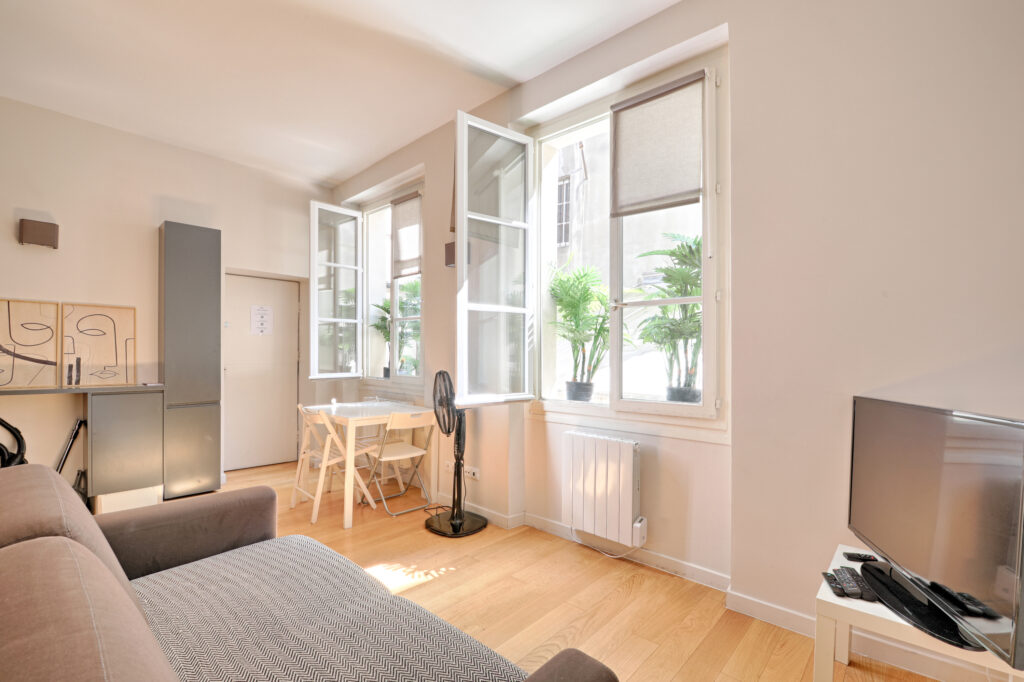 Le bien se trouve au 1er étage d’une très belle copropriété et, est composé d’une pièce à vivre avec canapé convertible et cuisine tout équipée (lave-linge, lave-vaisselle) ainsi que d’une chambre avec lit deux places et d’une salle de douche. Donnant sur cours, l’appartement est très calme et paisible.