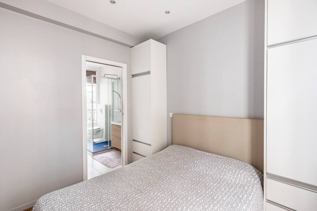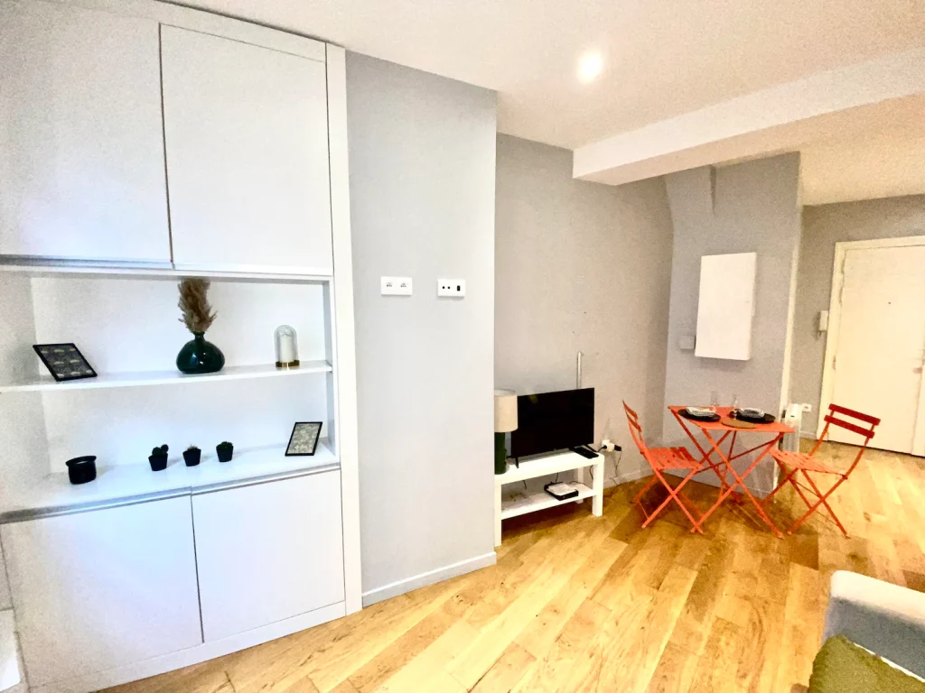 Ce beau 2 pièces refait à neuf au 2ème étage, se compose d’une pièce à vivre avec canapé convertible, rangements, table et chaises, une cuisine toute équipée ainsi qu’une chambre avec rangements et une belle salle de douche avec WC. Une buanderie avec lave-linge est accessible sur le palier.